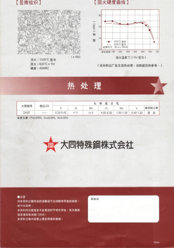 簡要描述:日本大同DH2F(40HRC預(yù)硬級(jí))熱作模具鋼:預(yù)硬易切削熱作模具鋼(40HRC)...