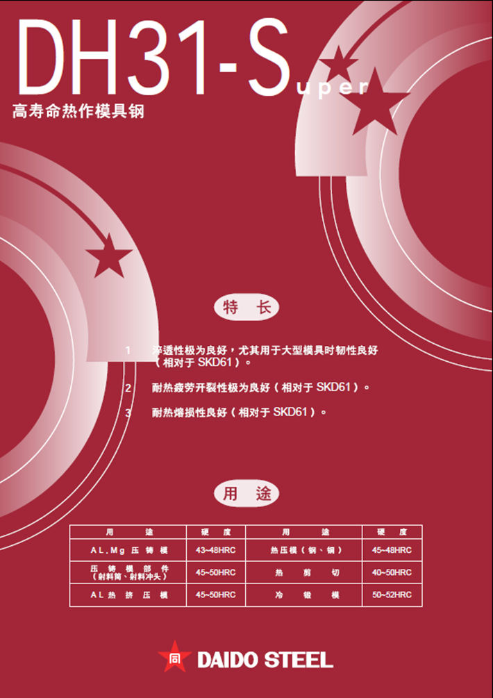 簡要描述:日本大同DH31-S熱作模具鋼:高韌性*高溫強度改良鋼...