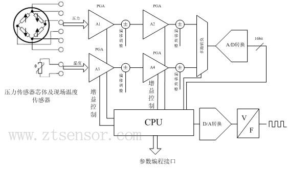 在敏感元件封裝,穩(wěn)定性處理后,必須對傳感器在數(shù)字域?qū)α泓c偏移、非線性、靈敏度、溫度進行補償才能達到0.01%的高精度要求。如圖是數(shù)字校正原理圖,壓力信號和溫度信號經(jīng)過放大,偏移調(diào)整,通過多路轉(zhuǎn)換開關(guān)輸入到A/D轉(zhuǎn)換端口,轉(zhuǎn)換后的數(shù)字信號被CPU通過校正算法校正,CPU將校正后的16位數(shù)字信號送到D/A轉(zhuǎn)換器,最終以電流或電壓的形式輸出,或直接以頻率信號輸出。