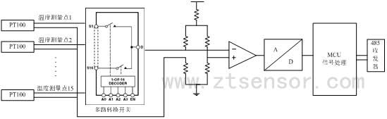 使用體積小、重量輕的鉑電阻(Pt100)作為溫度敏感元件,利用大規(guī)模集成多路轉(zhuǎn)換開(kāi)關(guān)分時(shí)選通每路溫度信號(hào),然后通過(guò)高速模數(shù)轉(zhuǎn)換器將模擬溫度信號(hào)轉(zhuǎn)換為數(shù)字信號(hào)。通過(guò)單片微處理器MCU將信號(hào)進(jìn)行數(shù)字濾波,線(xiàn)性校正,偏移補(bǔ)償,最終通過(guò)RS485總線(xiàn)將溫度數(shù)據(jù)以指定的幀格式傳送出去。