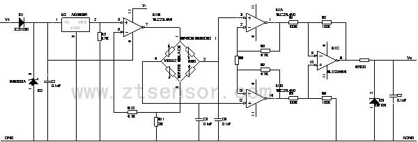 壓力傳感器電路設(shè)計 敏感芯體的補償同低溫,調(diào)理電路主要由電源極性保護、瞬壓抑制、恒流源電路、放大電路和限幅電路構(gòu)成。該電路的特點是所有器件使用模擬元器件輸出可以達(dá)到0~5V。該電路主要使用AD580和TLV2264兩個元器件,AD580提供2.5V的參考電壓,該電壓作為TLV2264的輸入,R11為電流采樣電阻,傳感器上的電流大小為2.5V/R11,該電流為浮地電流源。TLV2264另外3個運放構(gòu)成一個經(jīng)典的儀表運放,對敏感芯體的差模電壓進(jìn)行放大,輸出一個單端的0~5V信號。