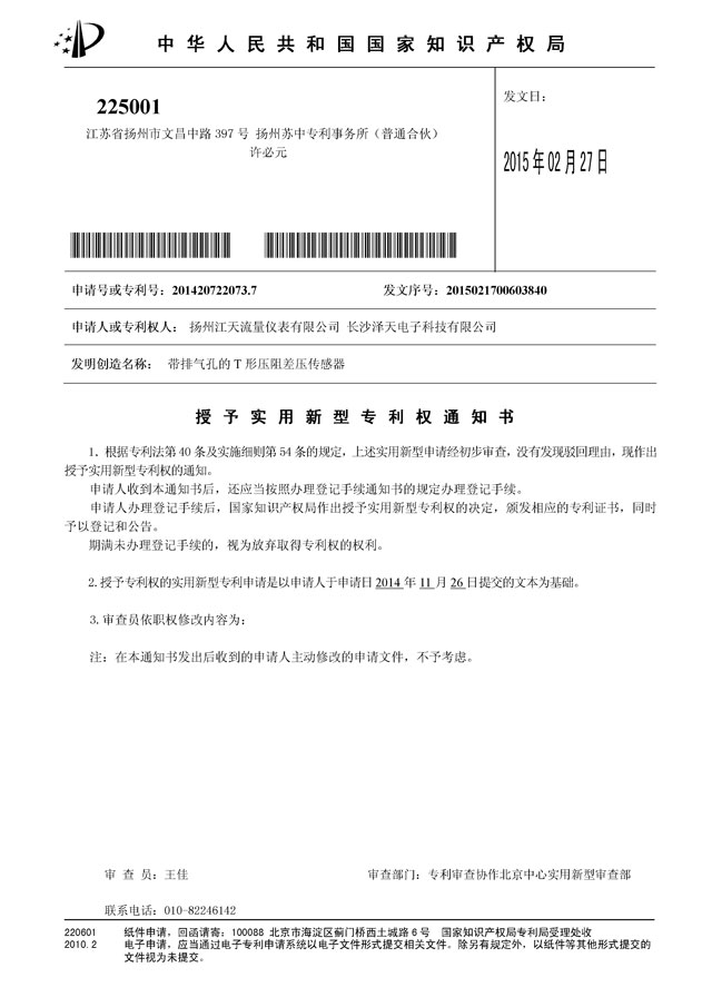 2015年2月27好,澤天傳感帶排氣孔的T 形壓阻差壓傳感器獲國家專利。
