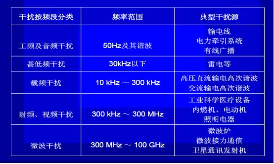 電磁干擾的產(chǎn)生包括發(fā)射源產(chǎn)生干擾噪聲的原因和接收源感受干擾噪聲的原因,發(fā)射源產(chǎn)生干擾噪聲的原因有:發(fā)射源的隱性頻率;發(fā)射源對(duì)接收源所產(chǎn)生的混附波與調(diào)幅干擾;發(fā)射源的不當(dāng)調(diào)幅調(diào)變輸出;接收機(jī)本地振蕩噪聲;時(shí)鐘信號(hào)傳送的衍生噪聲;電機(jī)裝置如馬達(dá)繼電器;電力系統(tǒng)如火花電暈噪聲;閃電雷擊。接收源感受干擾噪聲的原因有:接收源射頻頻率選用不當(dāng)造成噪聲滲入干擾;混附波與調(diào)幅干擾;電源線噪聲耦合至接收源造成干擾;電子盒箱柜隔離不佳滲入接收源造成干擾。電磁干擾的頻段劃分如下圖:
